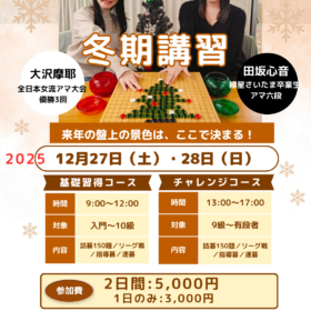 2025年も残り1ヶ月になりましたね。 当教室では冬休みに、落ち着いて囲碁に向き合いながら、基礎から実戦まで楽しく学べる講習を行います😊 日時 : 1…